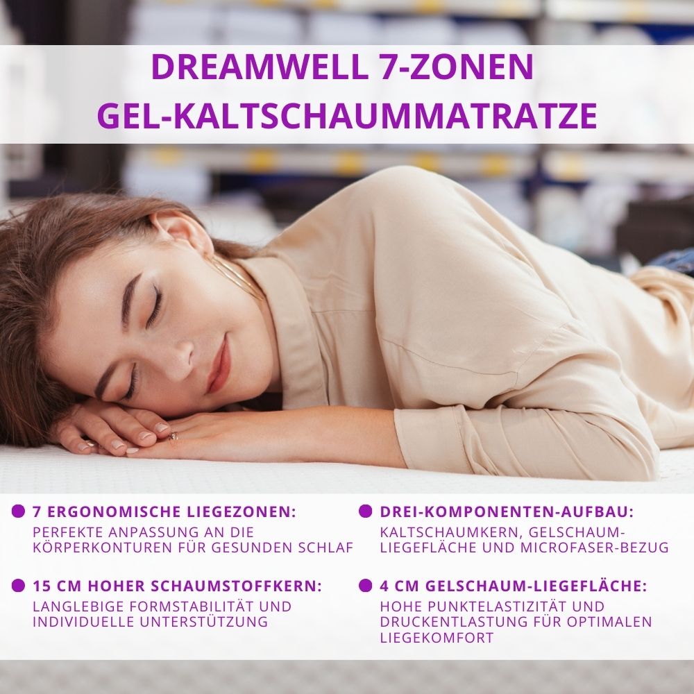 Erleben Sie mit der DreamRest 7-Zonen Duo-Gel Kaltschaummatratze eine neue Dimension des Schlafkomforts und starten Sie jeden Tag erholt und voller Energie.