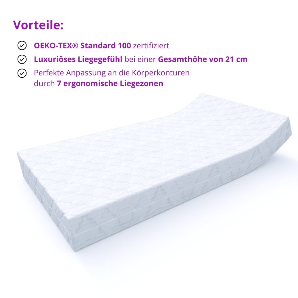 Der Kern der Matratze besteht aus einem 15 cm hohen Schaumstoffunterbau mit variablen Härtegraden von H2 bis H5. Dank der sieben ergonomischen Liegezonen und den rundum verlaufenden Klimakanälen passt sich die Matratze optimal an Ihre Körperkonturen an und fördert eine ausgezeichnete Luftzirkulation. Druckempfindliche Bereiche wie Schultern, Becken, Knie und Fersen können so perfekt einsinken, während andere Körperregionen ideal gestützt werden. Dies macht die Matratze ideal für Rücken- und Seitenschläfer.
