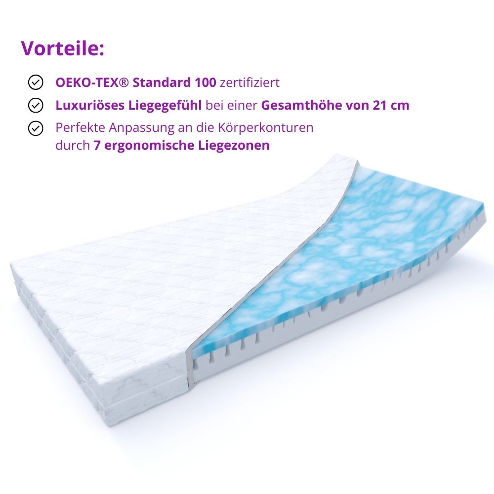 Der Gelschaum ist der Hammer! Im Sommer bleibt die Matratze angenehm kühl, kein Schwitzen mehr. Die 21cm Höhe macht das Aufstehen morgens viel leichter als bei meiner alten 16cm Matratze. Nach 4 Monaten keine Kuhlen, alles noch wie am ersten Tag. Der Bezug war nach einem Malheur mit Kaffee schnell gewaschen und wieder drauf - praktisch!