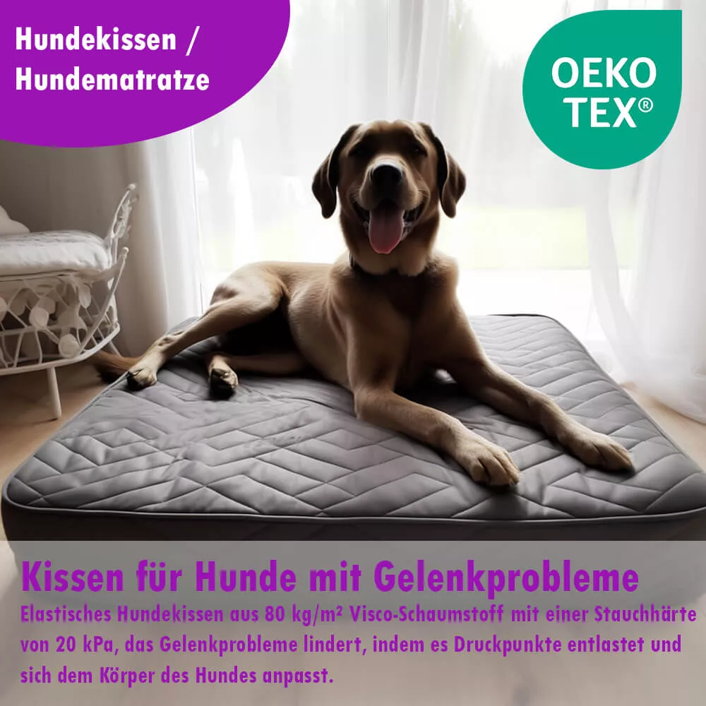 Elastisches, gelenkschonendes Hundekissen für Hunde. Der verwendete Schaumstoff ist ein hochwertiger Visco-Schaumstoff, der sich optimal dem Körper des Tieres anpasst und insbesondere die Druckpunkte an den Gelenken entlastet. Dadurch werden Gelenkprobleme geschont bzw. können Gelenkprobleme vermieden werden. Das Visco-Hundekissen verfügt über ein Raumgewicht von 80 kg/m² und einer Stauchhärte von 20 kPa.