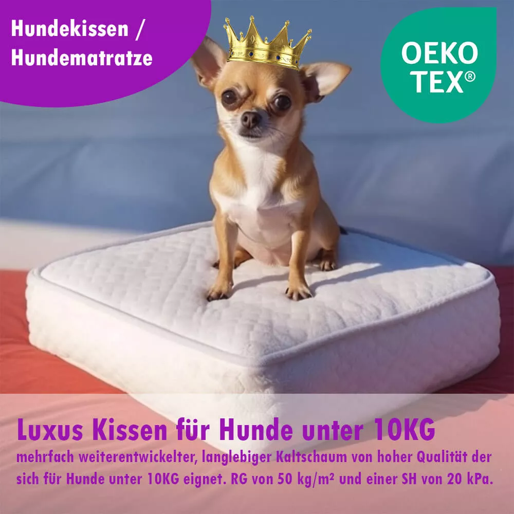 Hochwertiges Hundekissen für Hunde bis 10 kg Körpergewicht. Der verwendete Schaumstoff ist ein mehrfach weiterentwickelter, langlebiger Kaltschaum von hoher Qualität mit einem Raumgewicht von 50 kg/m² und einer Stauchhärte von 20 kPa.