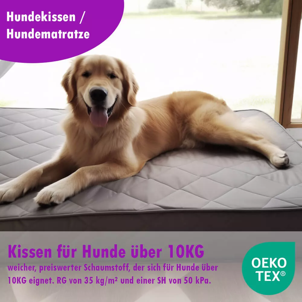Ideales Hundekissen für Hunde über 10 kg Körpergewicht. Der verwendete Schaumstoff ist ein weicher, preiswerter Polyurethan-Weichschaumstoff mit einem Raumgewicht von 35 kg/m² und einer Stauchhärte von 50 kPa.