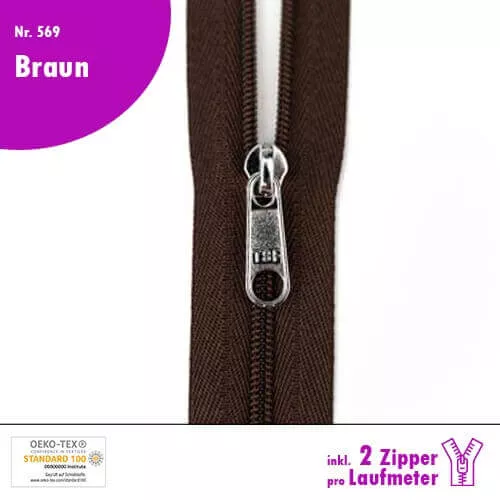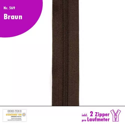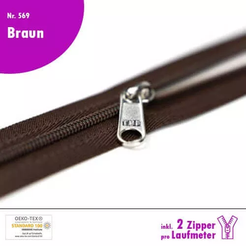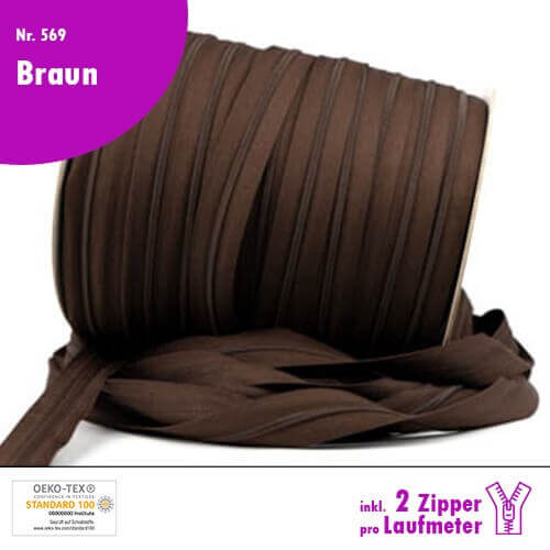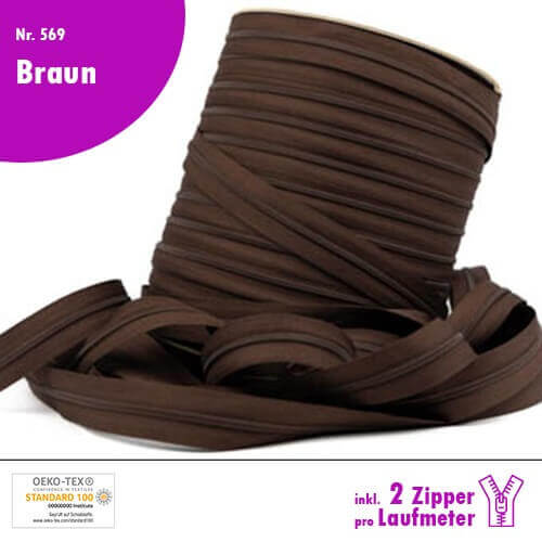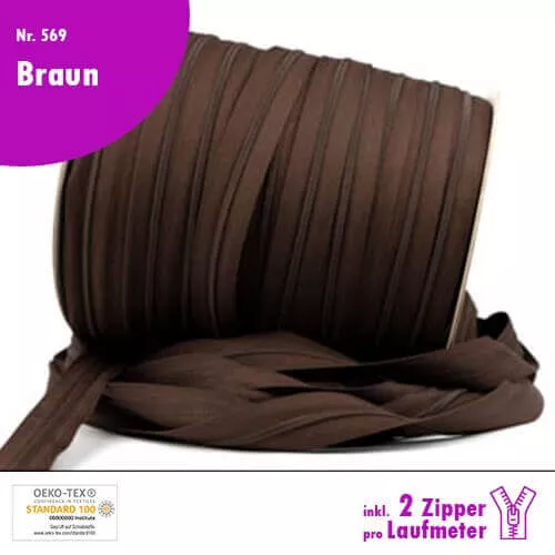 Qualitäts-Reißverschluss Nr. 569 in Braun, in deiner Wunschlänge inkl. 2 Zipper pro Laufmeter!