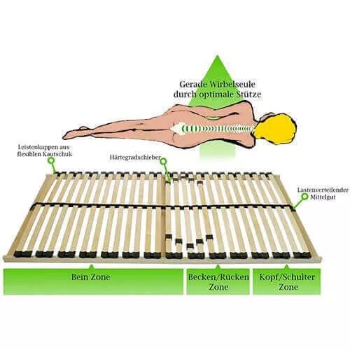 Der Lattenrost verfügt über extrabreite Federholzleisten und bietet damit eine Traglast von bis zu 200 kg. Die Leisten sind mit wenigen Zentimetern Abstand zueinander angebracht - für eine hohe Belastbarkeit. Zudem sind die nach oben gewölbten Leisten flexibel, sodass die Matratze optimal aufliegt und ihre gewünschte Funktion erfüllt.