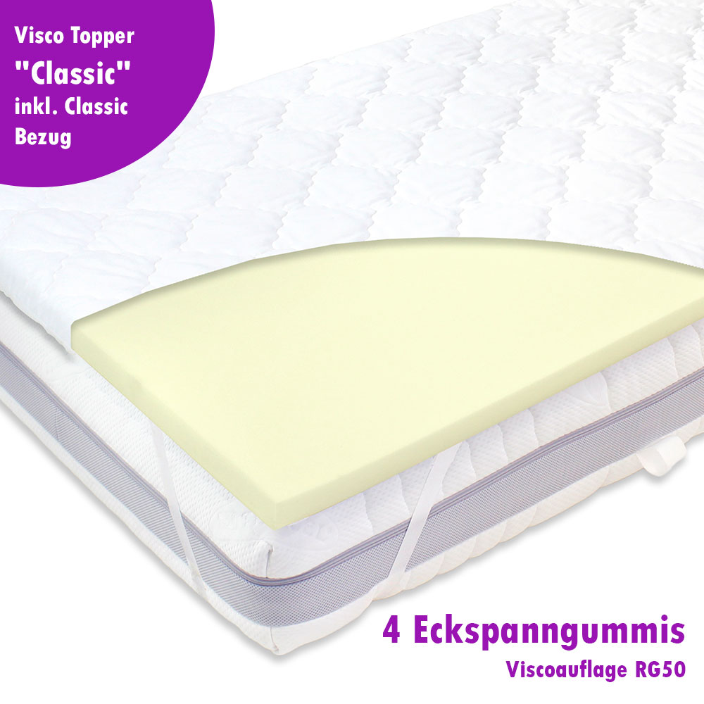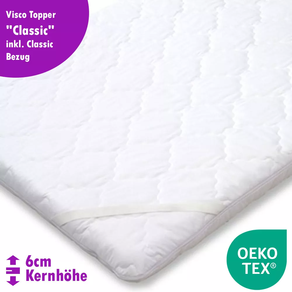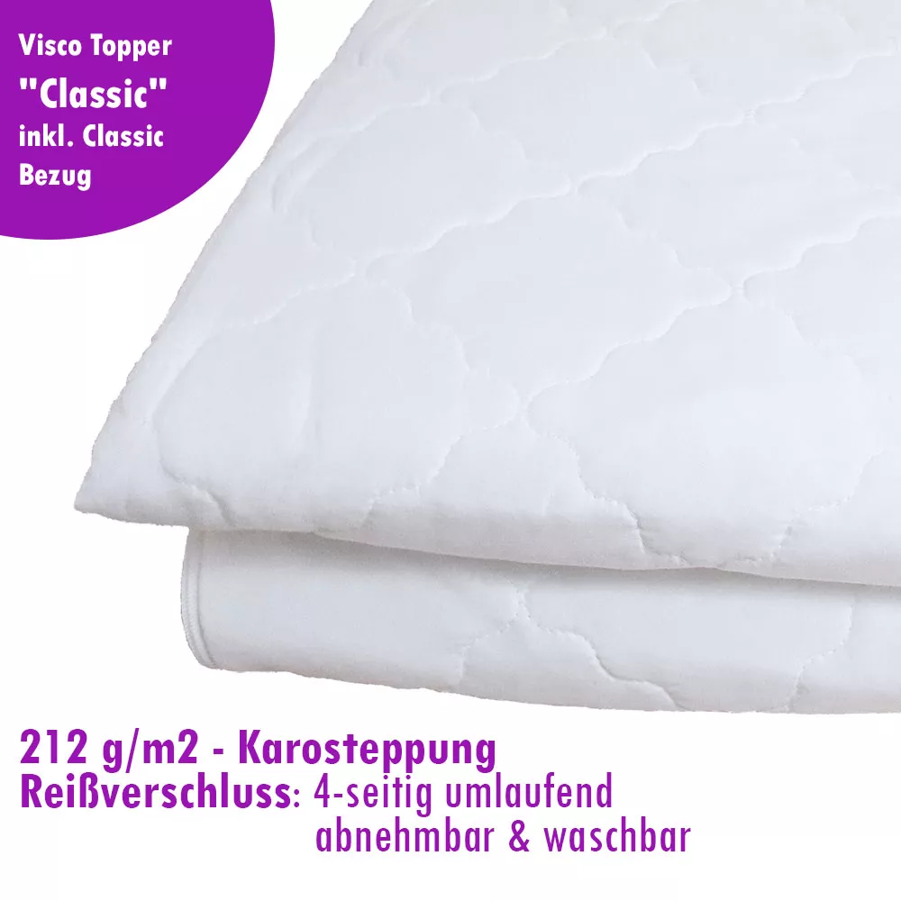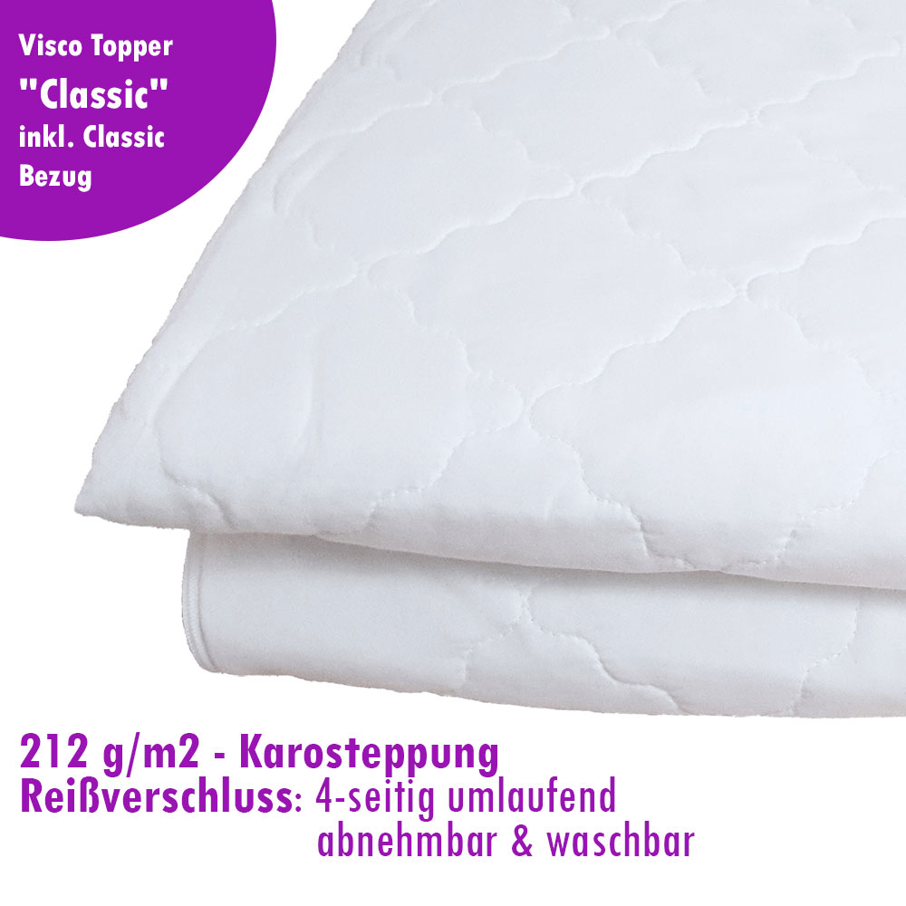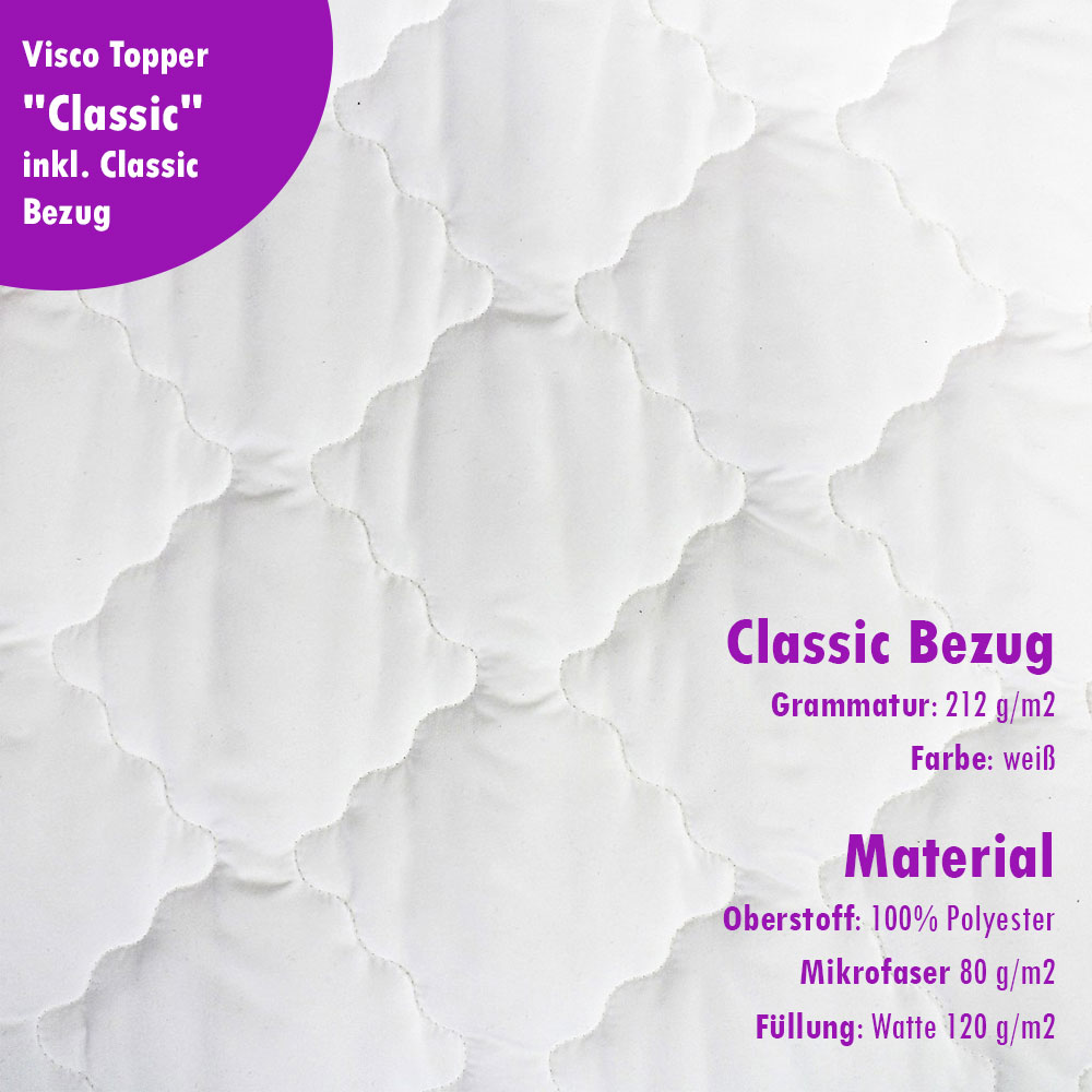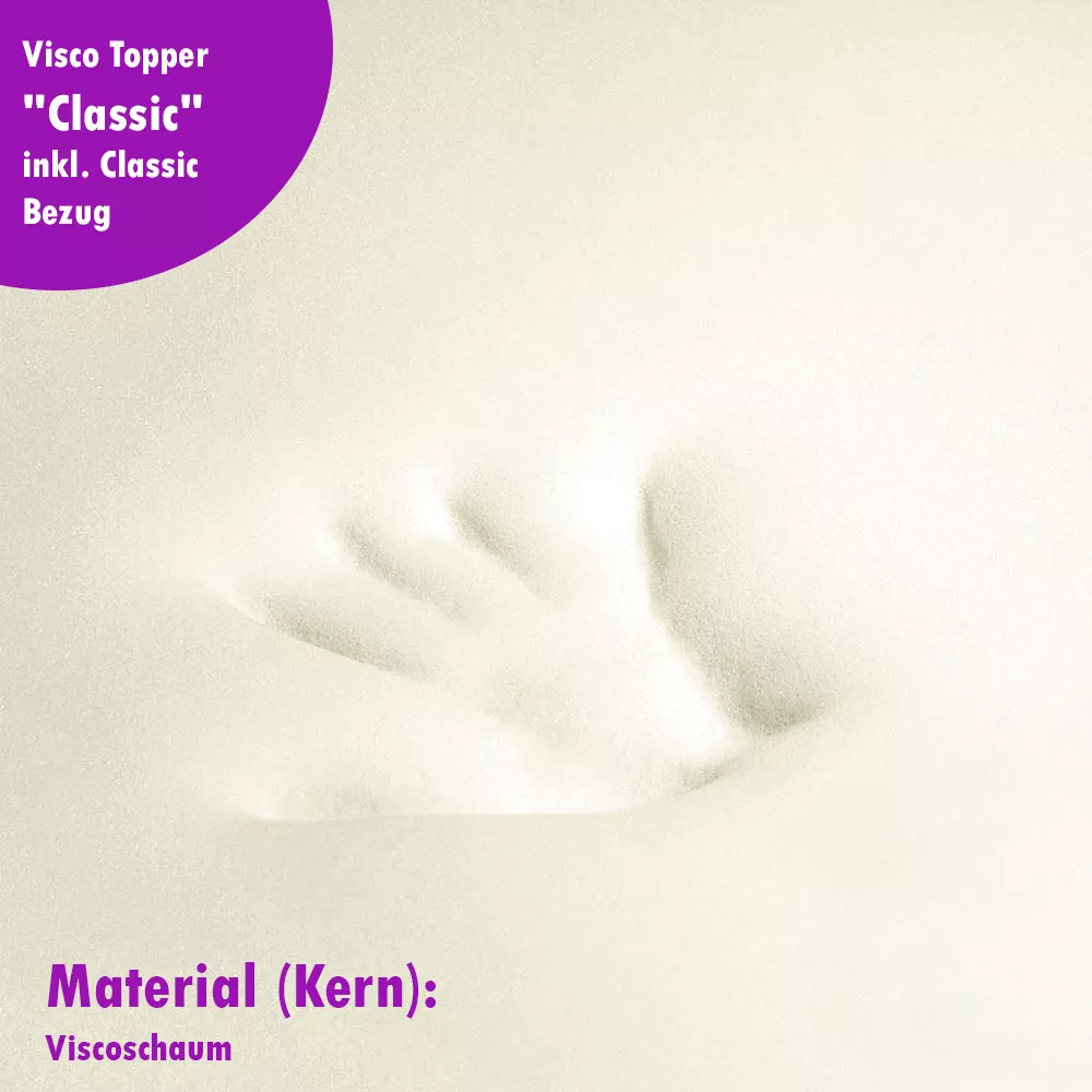 Die Matratzenauflage besteht zu 100% aus Viscoschaumstoff mit einem Raumgewicht von 50 kg/m³ und einer Stauchhärte von 1,5 kPa. Der Bezug mit einer Grammatur von 212 g/qm sorgt für ein angenehmes und gesundes Schlafklima. Der Topper ist atmungsaktiv, feuchtigkeitsregulierend und frei von Staub und Bakterien, wodurch er auch für Allergiker geeignet ist.