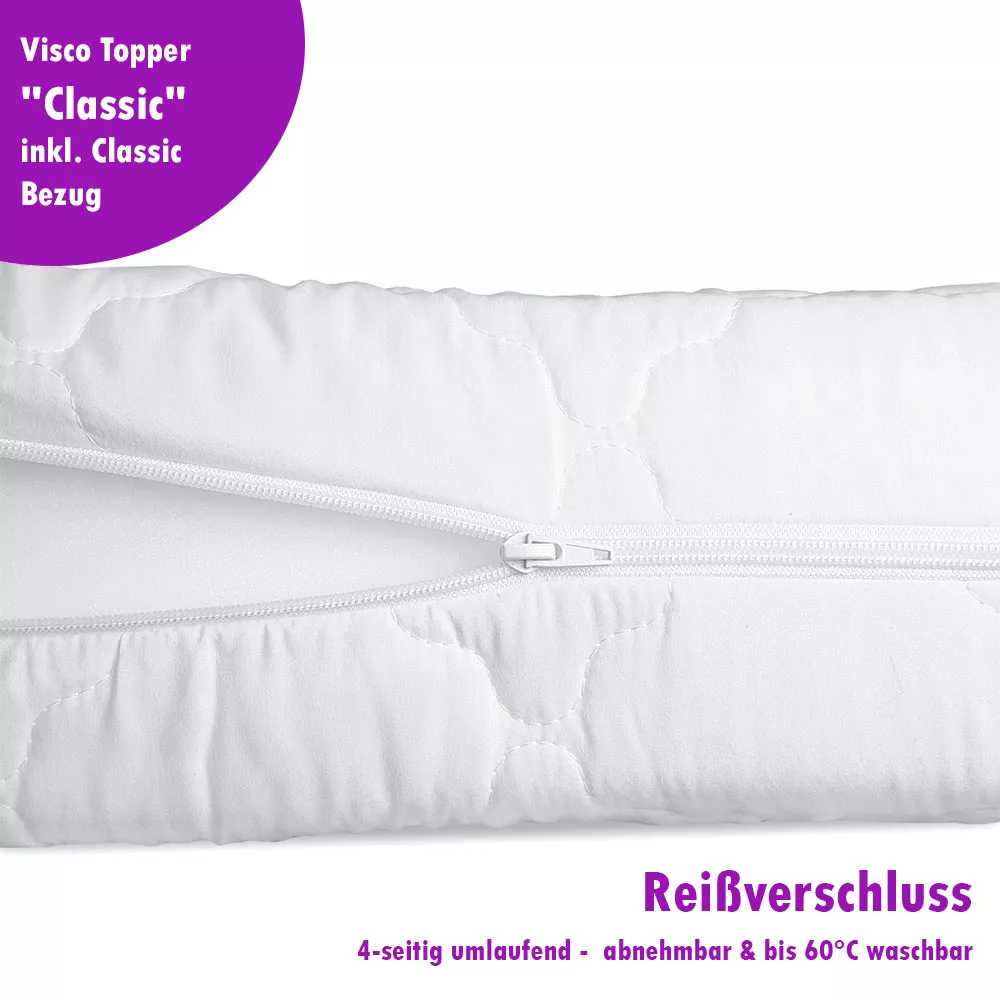 Die viscoelastische Matratzenauflage mit Bezug und einer Höhe von 6 cm besteht aus hochwertigem Viscoschaumstoff. Dieser Schaumstoff bietet eine nahezu perfekte und konturgenaue Anpassung an den Körper und sorgt für eine gleichmäßige Druckverteilung. Gleichzeitig bietet er ausreichend Festigkeit, um den Körper zu stützen.